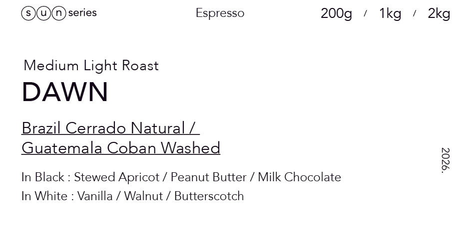 繼2018三款配方豆後, 我們於2023/11產出新的配方: 晨曦 DAWN,雖為淺中焙,風味不是最突出, 卻非常柔順。黑咖啡的風﹔黃桃,蘋果的果酸, 榛果調性。對上牛奶後的奶咖﹔像是奶油糖般的香甜。